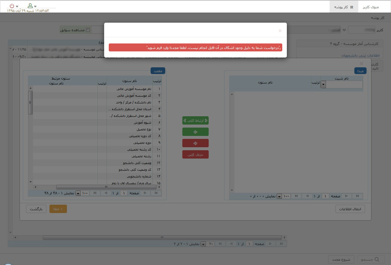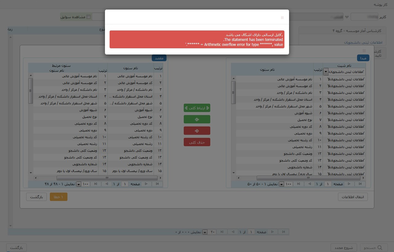 در قسمت مبدا،" نام شیت" صحیح انتخاب نشده است. مثلا برای ارسال فایل دانشجویان، شیت اطلاعات ثبتی دانشجویان انتخاب شود.