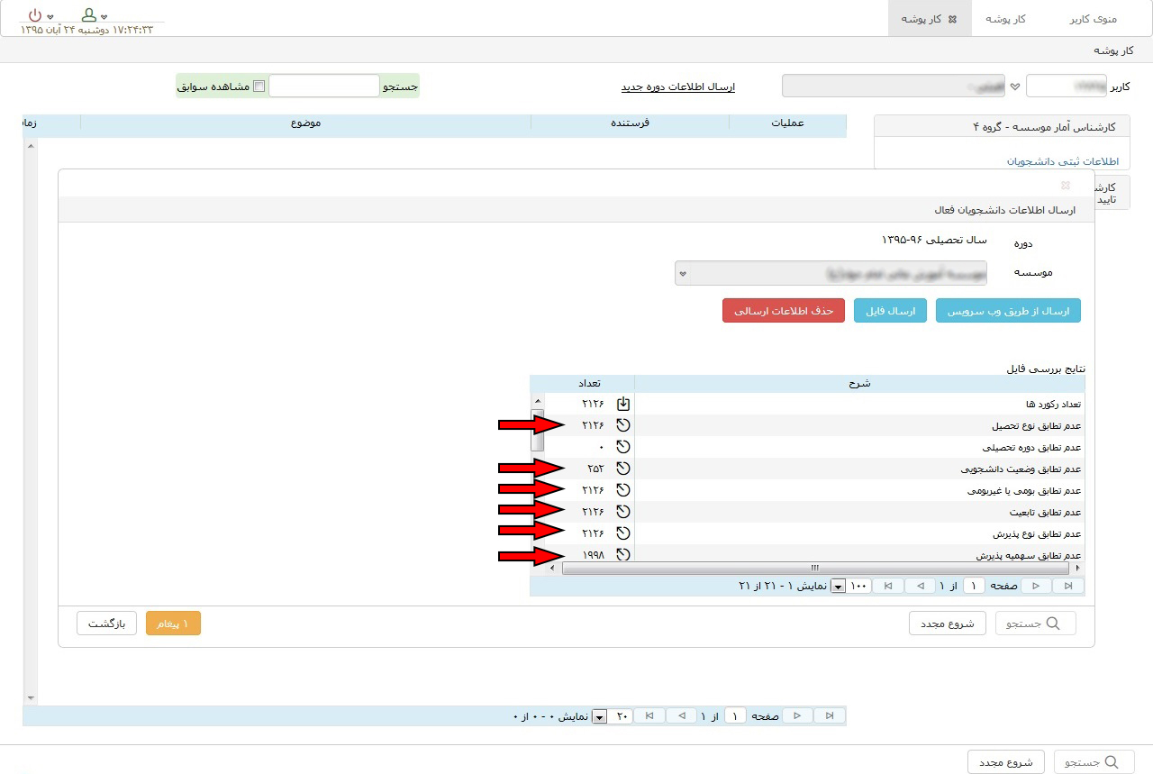 - مقدار وارد شده در ستون های تعداد نیمسال های مرخصی، تعداد نیمسال های مشروطی، جمع واحد گذرانده، جمع واحد باقیمانده، معدل، تعداد درس ثبت نامی و ... بیشتر از مقادیر مجاز است.