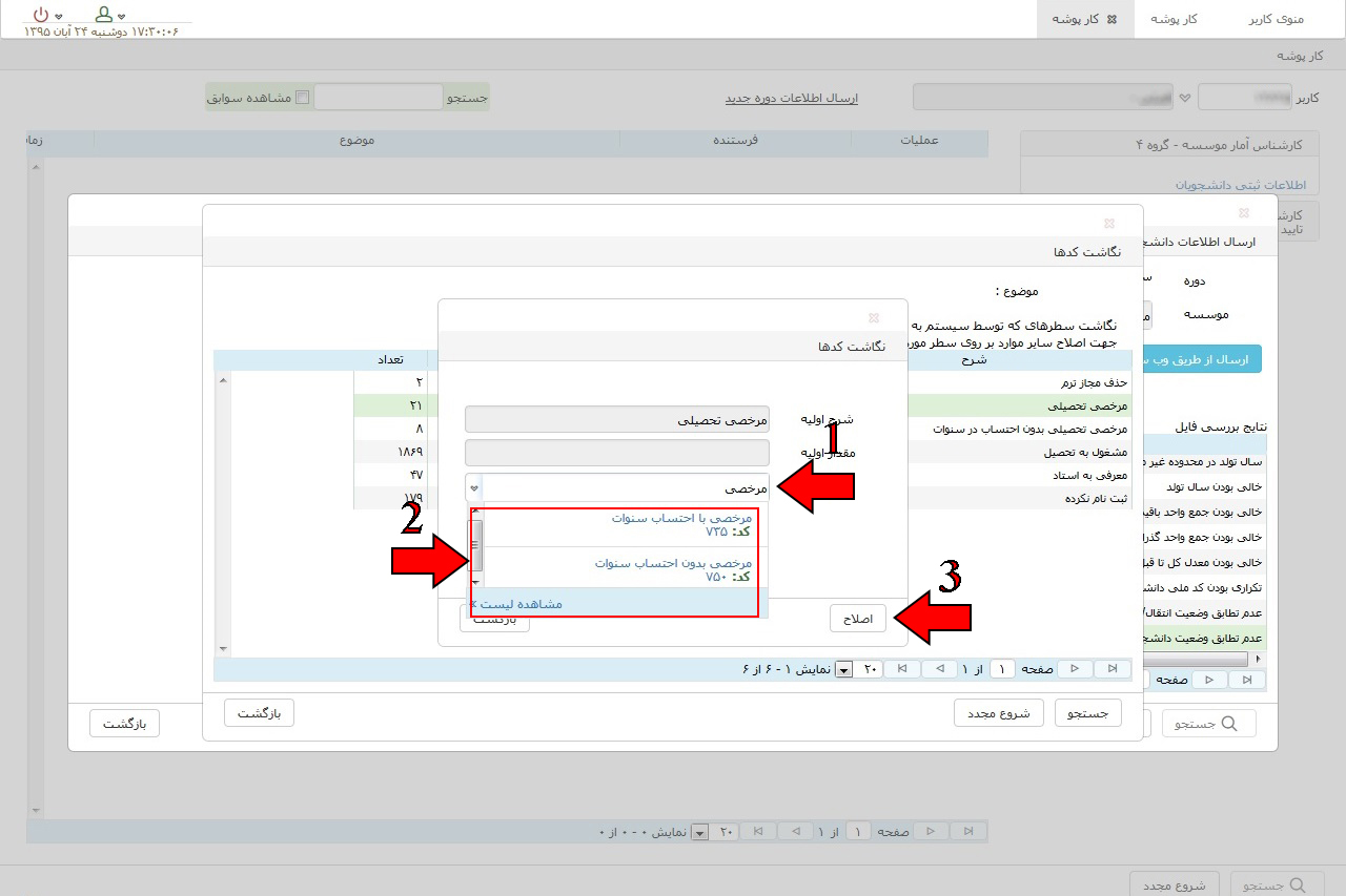 ۳. در پنجره جدید "شرح اولیه" اطلاعاتی که در فایل شما موجود است را نمایش می دهد و شما باید معادل آن را در قسمت "نگاشت" پرکنید. به این صورت که در قسمت نگاشت کلیک کرده و شروع به تایپ نمایید. پس از تایپ قسمتی از اطلاعات مورد نظر توسط کاربر، گزینه های مورد قبول از طرف موسسه پژوهش و برنامه ریزی به کاربر پیشنهاد داده می شود. گزینه صحیح را انتخاب کرده و دکمه اصلاح را کلیک نمایید تا پنجره بسته شود.
