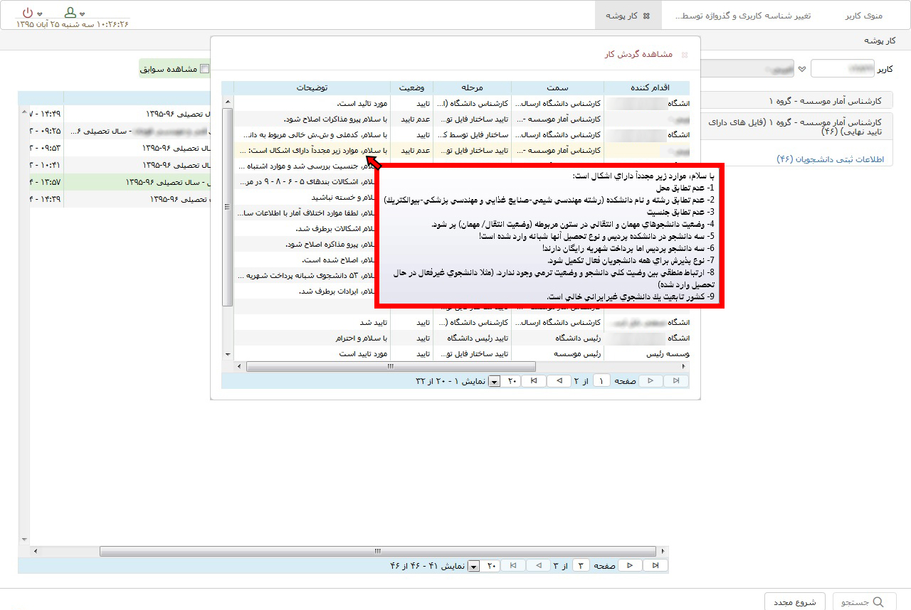 ۲. در صورتی که کارشناس موسسه پژوهش و برنامه ریزی اطلاعات را به کاربر ارجاع داده باشد، کاربر می تواند به وسیله اسکرول بار به منتهی الیه سمت چپ رفته و در قسمت "توضیحات" با نگه داشتن موس بر روی متن، یادداشت کارشناس موسسه پژوهش و برنامه ریزی را به صورت کامل مشاهده کند.
