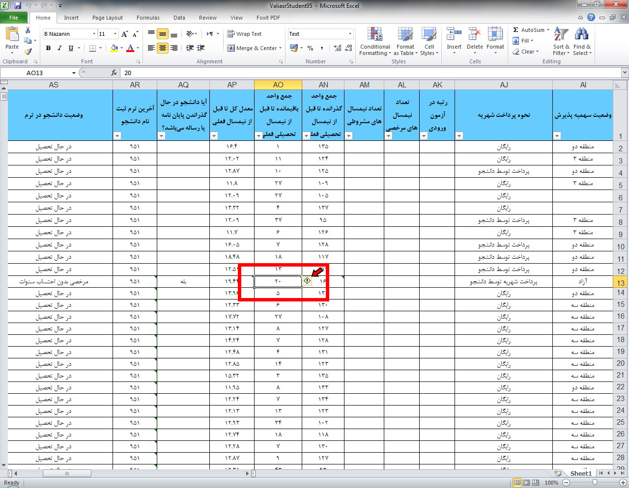 ۴. سپس مشاهده می نمایید که مثلث سبز رنگ از کنار سلول برداشته شد. این کار را برای تمامی مواردی که جزو اشکالات است انجام داده و پس از بارگذاری مجدد فایل در پرتال، این ستون دیگر به عنوان خطا نمایش داده نمی شود.