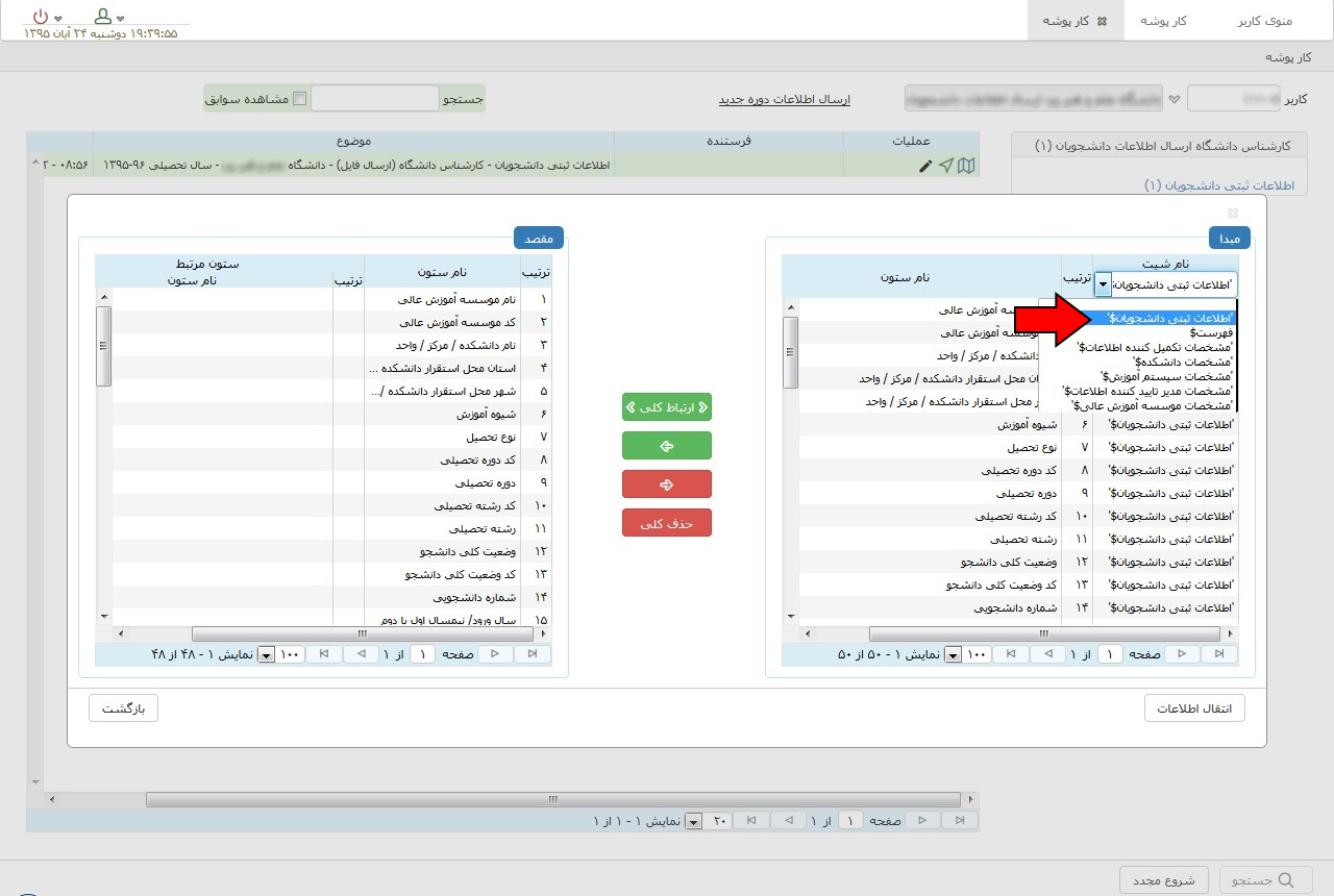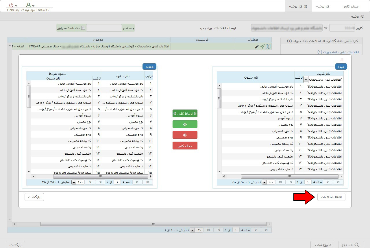 اگر ردیفی در "ستون مرتبط" خالی است باید آن ردیف را انتخاب کرده سپس در قسمت مبدا عنوان مشابه آن انتخاب کنید و دکمه را کلیک کنید. دقت کنید که در قسمت مقصد کلیه ردیف ها در ستون مرتبط باید پر شده باشد.