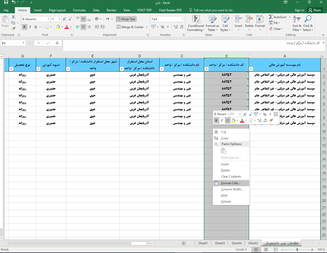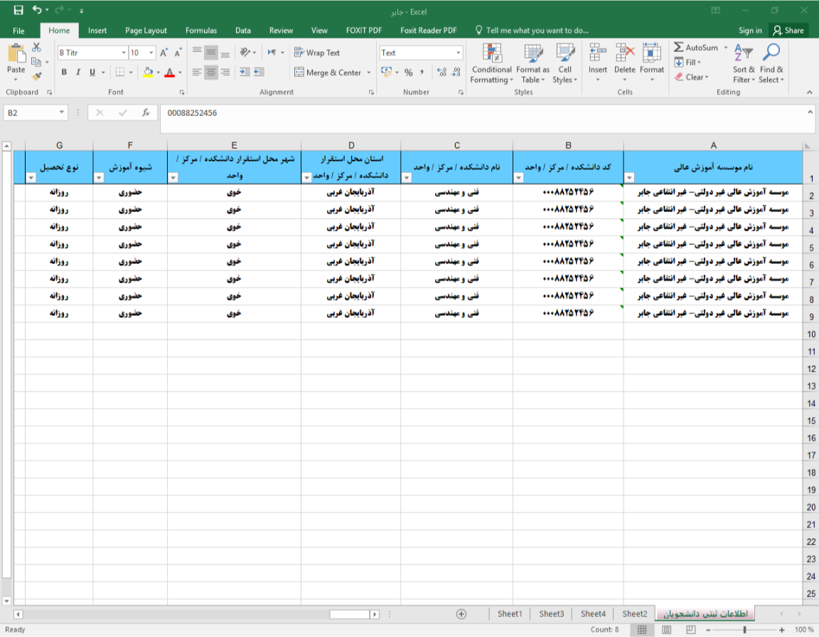 ۴. مجدداً کد مربوط به دانشگاه یا دانشکده خود را از فایل های موجود در سایت Copy کرده و در ستون " کد دانشکده / مرکز / واحد " فایل اکسل خود Paste نمایید. (دقت نمایید که درصورتی که در ابتدای کد دانشگاه صفر وجود دارد، باید بعد از کپی در فایل اکسل خود نیز، صفرهای ابتدای کد مشاهده شود)